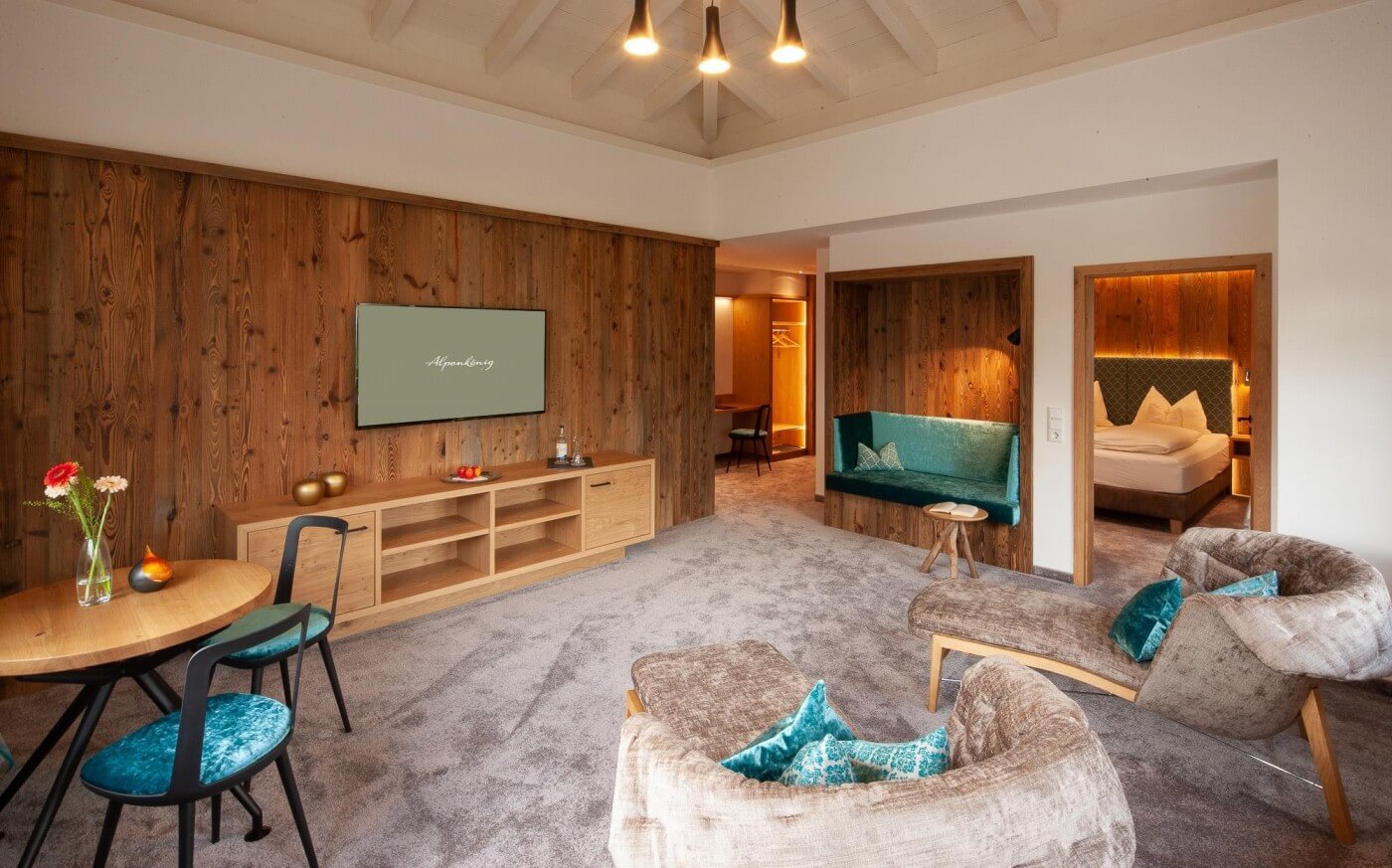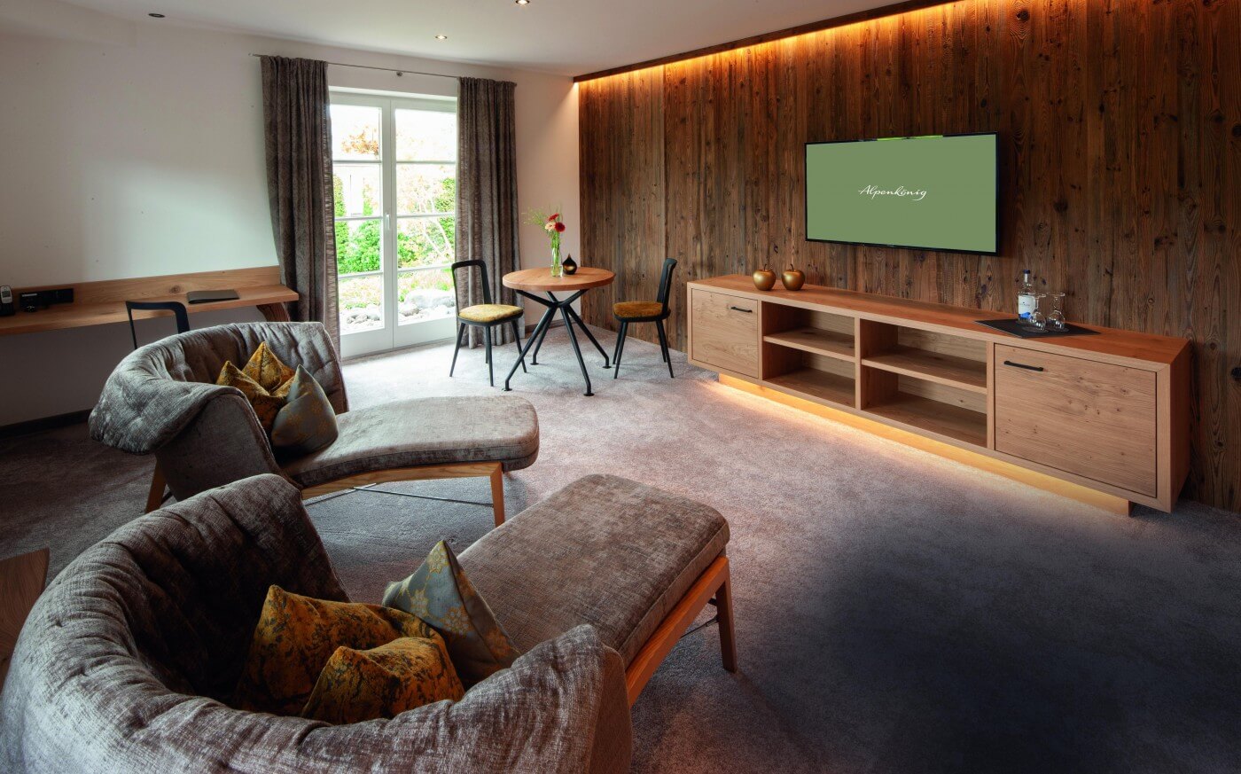 Erleben Sie höchsten Komfort in unseren Gartensuiten und genießen Sie den alpinen Landhaus-Stil in seiner schönsten Form. Mit eigener Terrasse, edlen Materialien und einem getrennten Wohn- und Schlafbereich schaffen wir einen Ort, der zum Entspannen und Verweilen einlädt.Für Ihre ganz persönlichen Wohlfühlmomente erwarten Sie liebevolle Details, modernste Ausstattung und das unverwechselbare Alpenkönig-Flair.Ihr privates Refugium – für unbeschwerte Tage voller Ruhe, Genuss und Erholung.